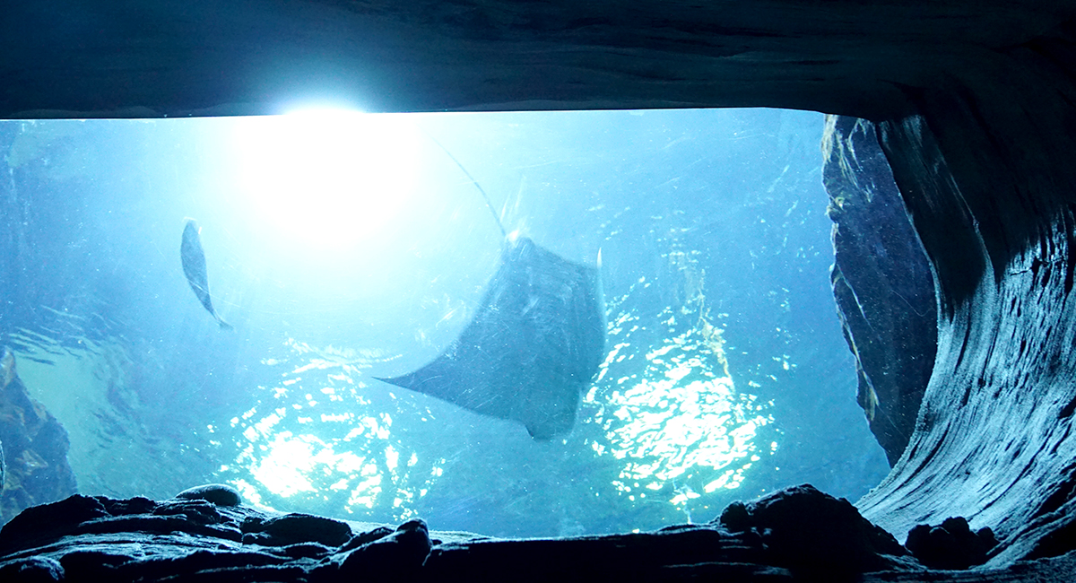 전시장 로비에서 바라본 천장은 거대한 상어와 가오리 조형물로 압도적인 느낌이 든다.