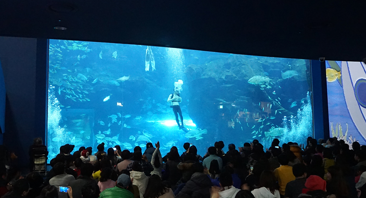 마치 영화관에서 보는 듯한 큰 사이즈의 메인 수족관 앞은 이미 관람객들로 즐비하다.