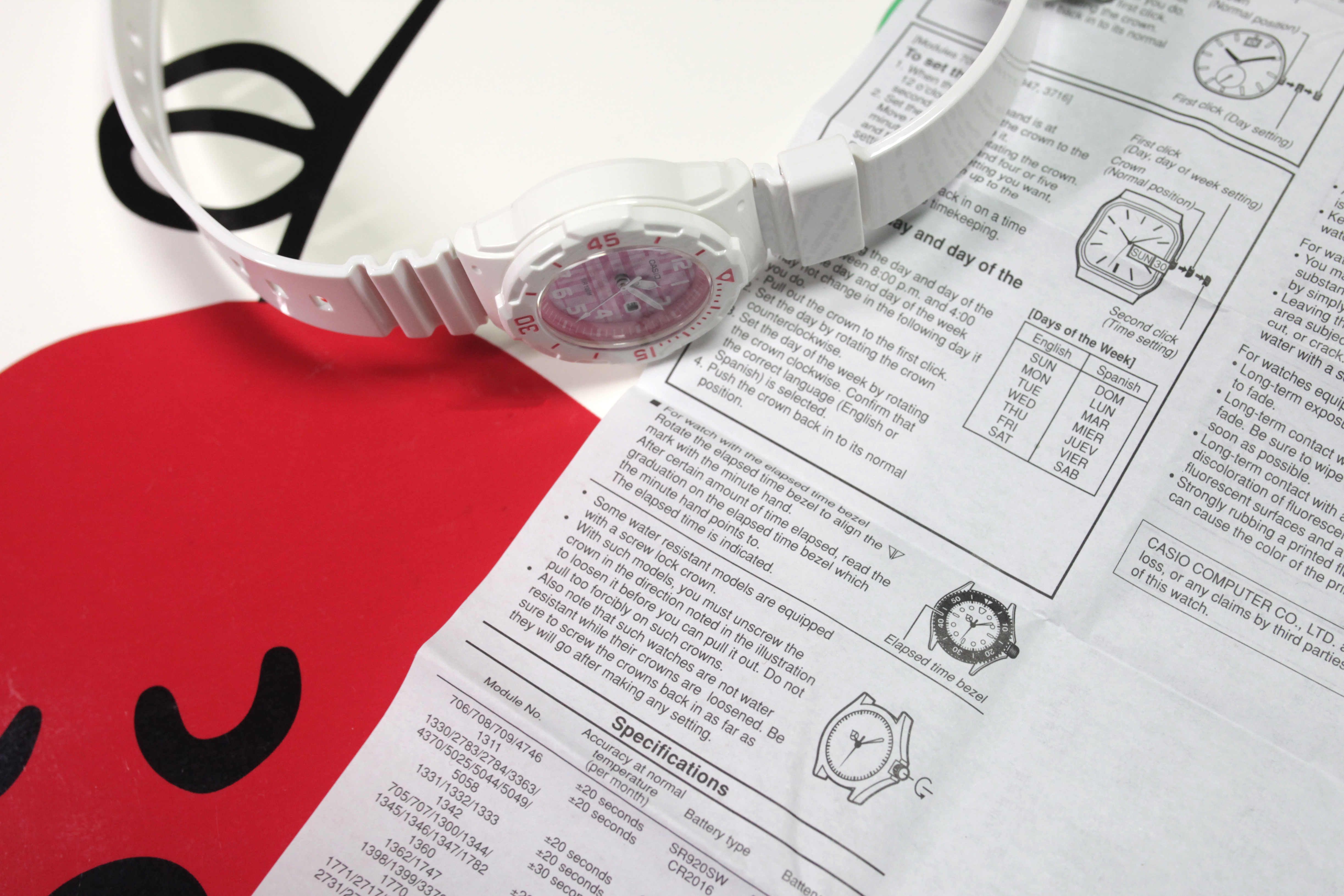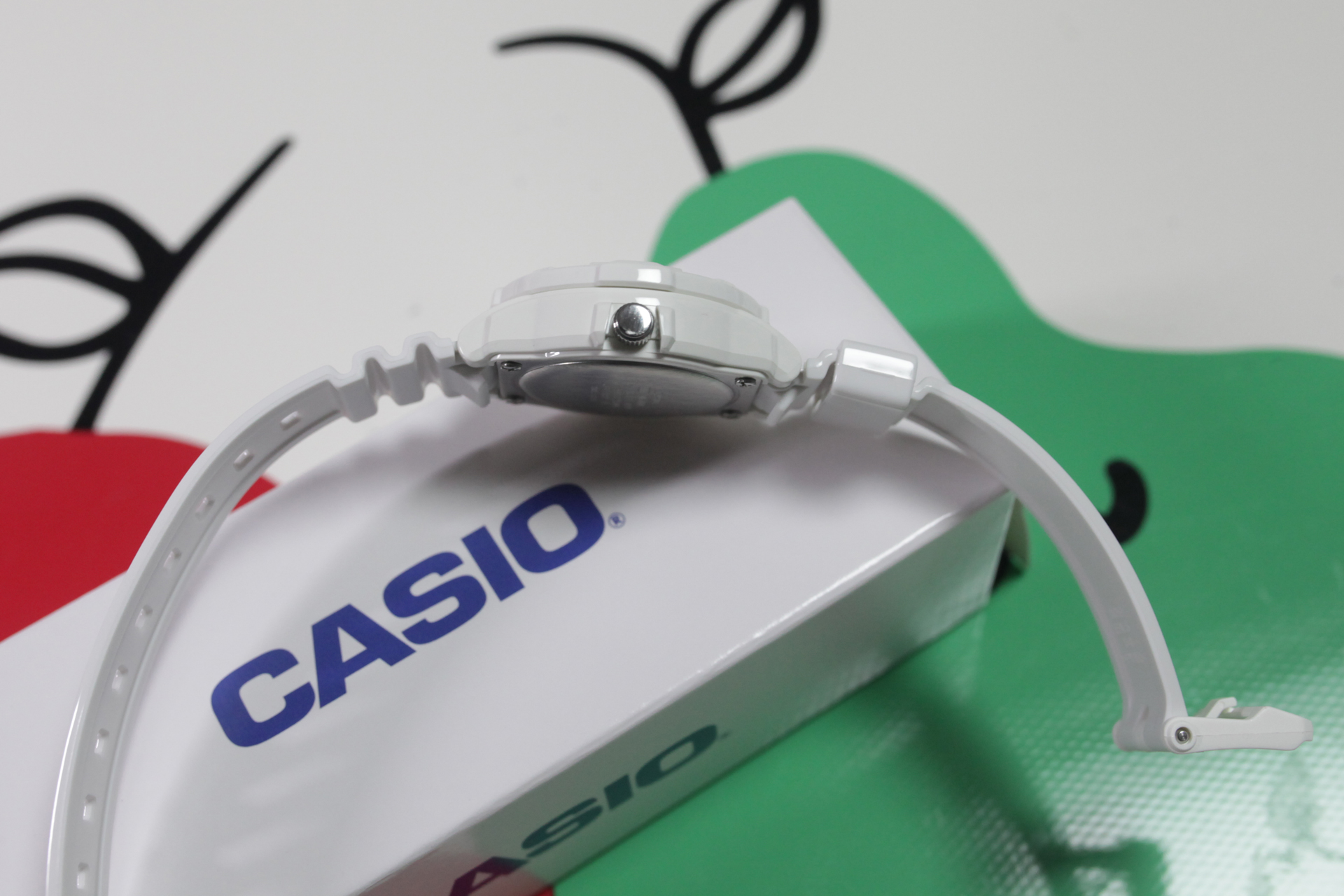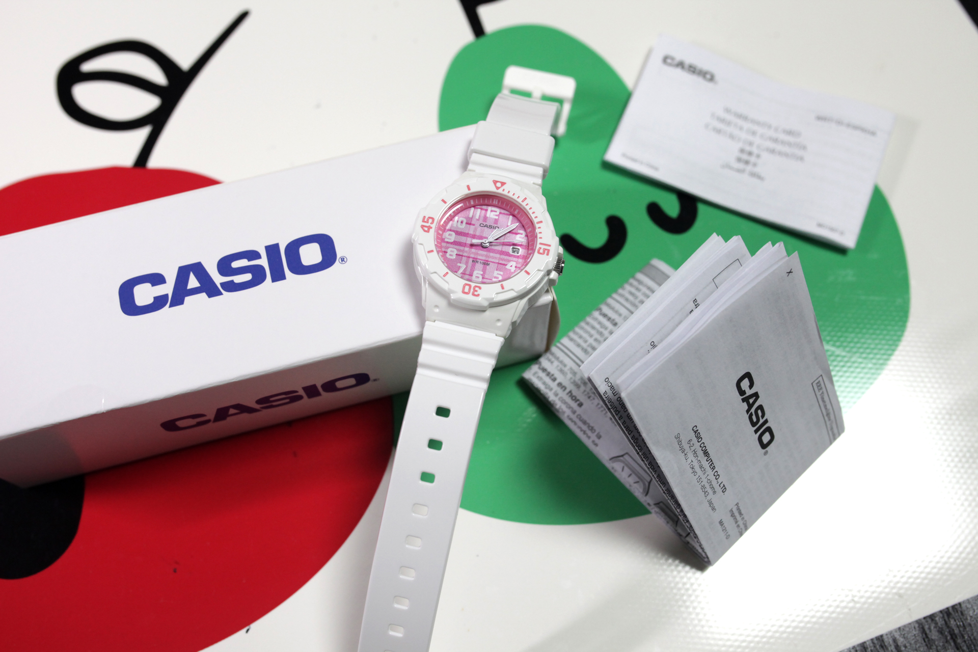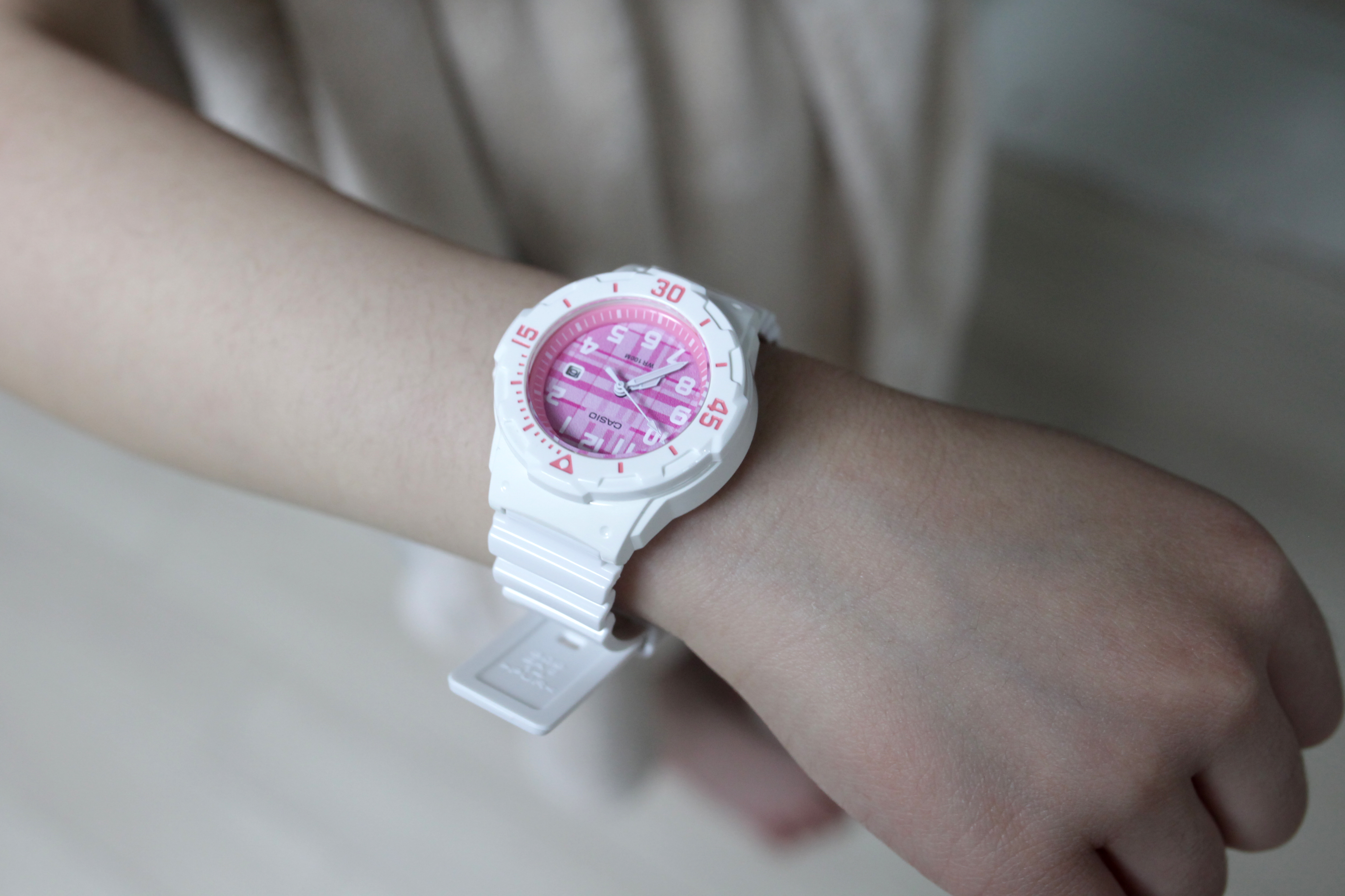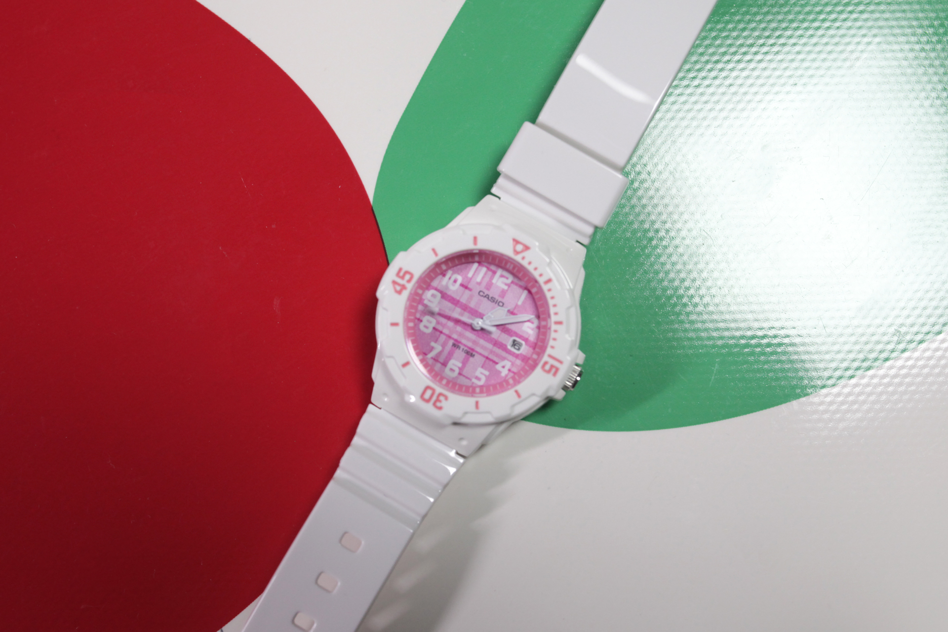LRW-200H-4CV는 화이트 컬러의 본체와 핑크 톤의 숫자 및 디테일이 조화롭게 어우러져 있다.