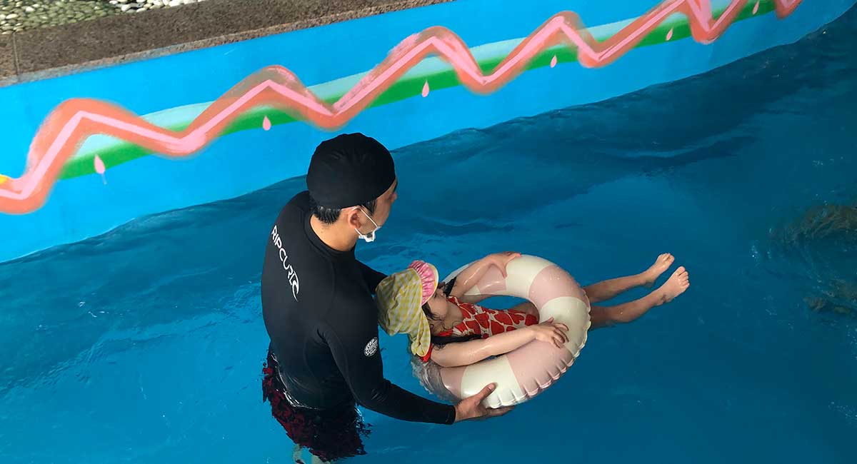 입구 쪽에서 바라보는 왼쪽에는 폭이 좁은 직사각형의 키즈풀이 있다.