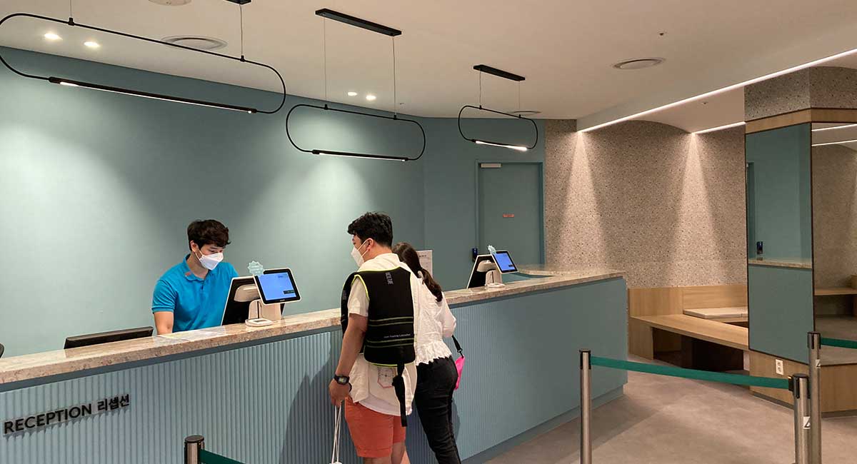아쿠아벤쳐의 입구는 눈에 띄는 민트색으로 리셉션과 내측 공간으로 구분되어 있다.