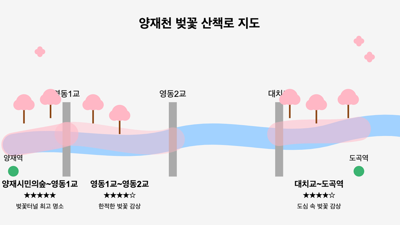 - 대치교~도곡역 구간 : 도심과 가까우면서도 아름다운 벚꽃을 감상할 수 있는 구간이다.