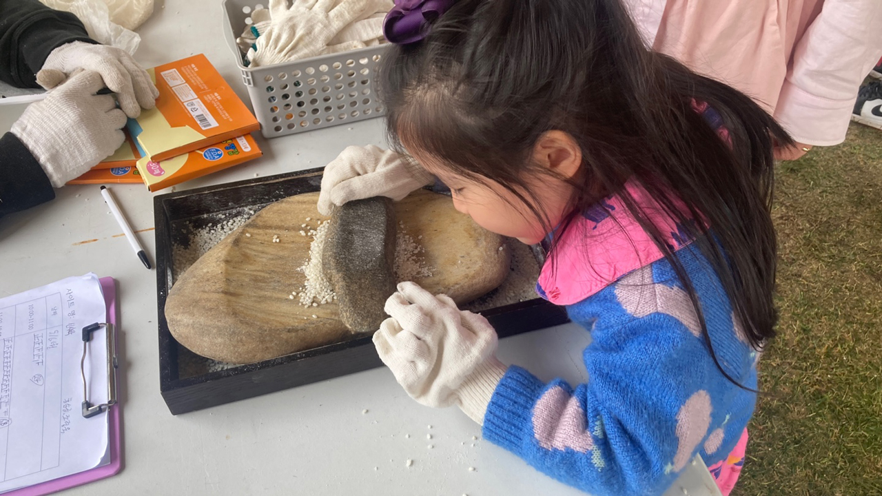 널따란 나무판 위에 쌀을 올려놓고 돌로 쌀을 갈아 보는 체험을 했다.
