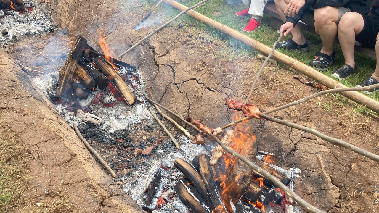 긴 나무 꼬치에 고기를 꿰어 직접 불 위에서 구워 먹는 원시적인 조리법은 아이에게 신선한 경험이었다.