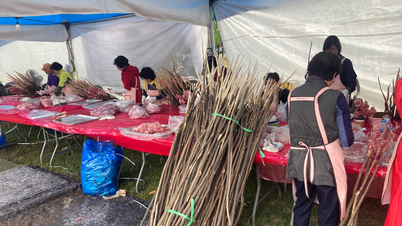 사람 키만 한 나무 꼬지와 연천 돼지고기 목살 부위가 손질되고 있었다.