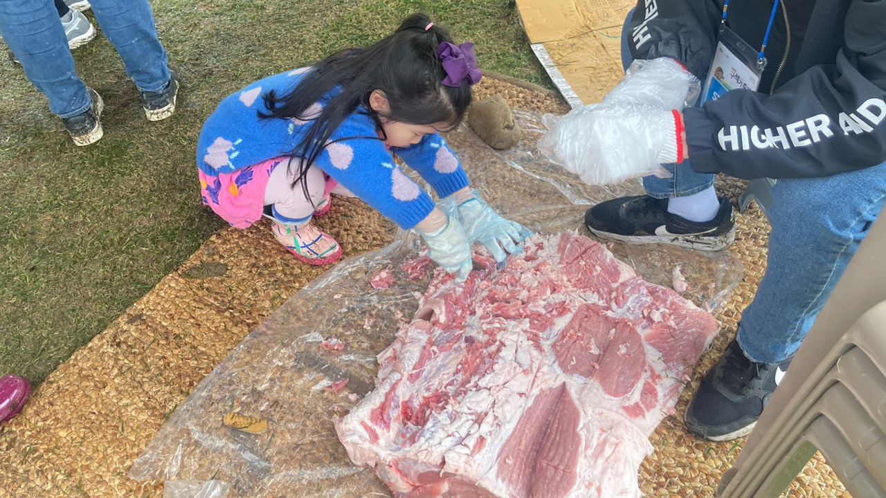 제 몸보다 큰 고깃덩어리를 돌칼로 잘라내는 체험이다.