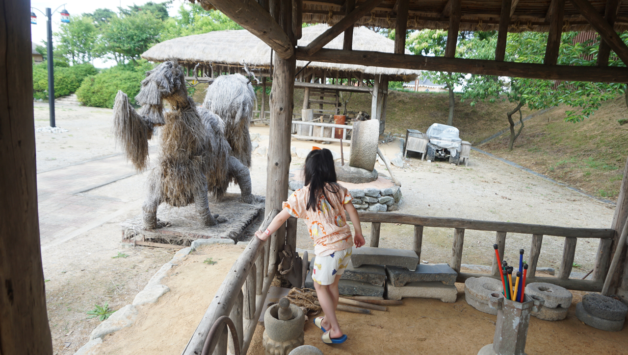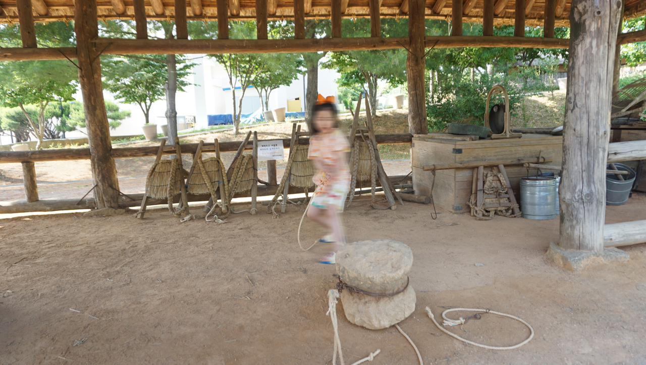 커다란 돌을 이용해 곡식을 찧는 연자방아와 발로 밟아 작동시키는 디딜방아는 아이가 시소를 타듯 재미있어했다.