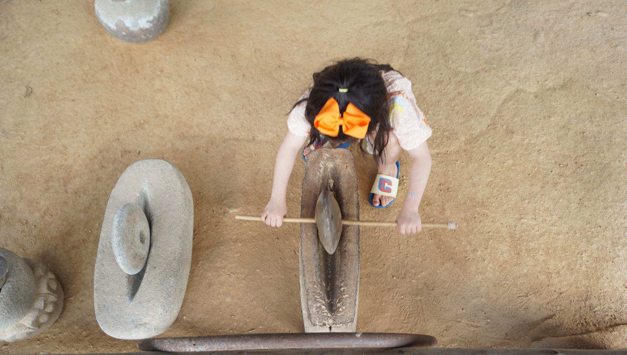 아이와 함께 발로 밟아보며 쌀을 찧는 과정의 어려움을 체험할 수 있었다.