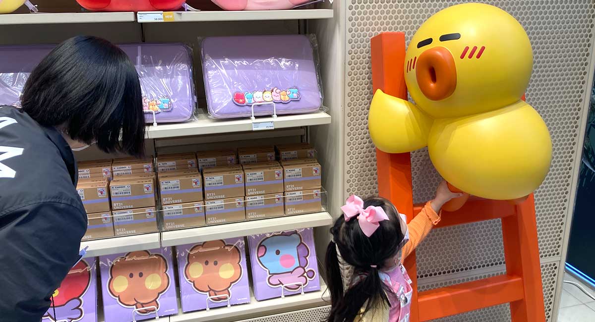 내가 한참 bt21 캐릭터의 제품들을 구경하는 사이, 딸 아이는 저 멀리 노란색 새 앞에 있었다.