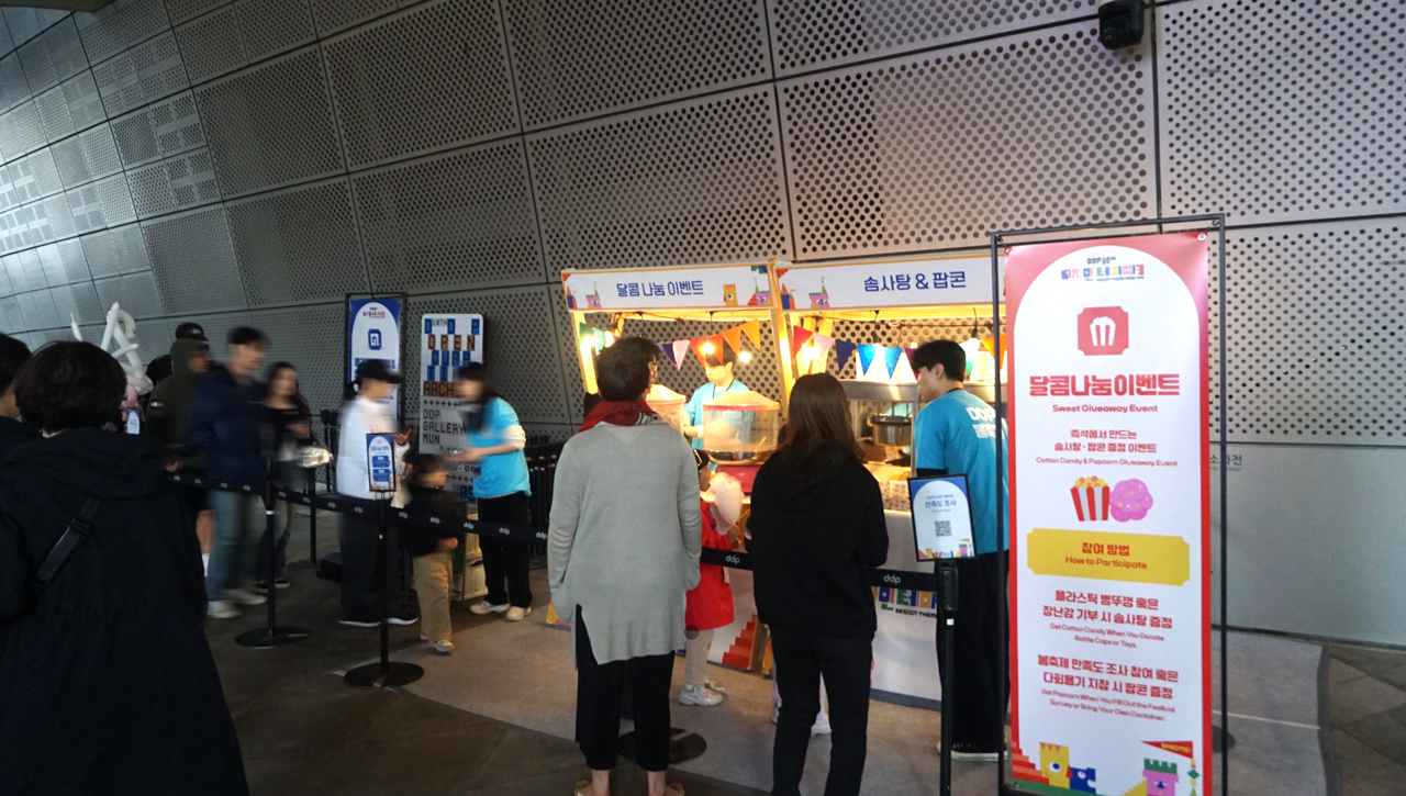 플라스틱 병뚜껑 혹은 장난감을 기부하면 솜사탕과 팝콘을 받을 수 있다.