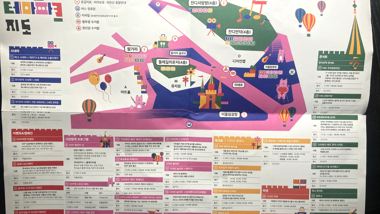 디자인 테마파크 지도를 확인하고 이벤트 공간, 시민참여 프로그램 공간, 워크숍, 마켓 등 다양한 프로그램을 살펴볼 수 있다.