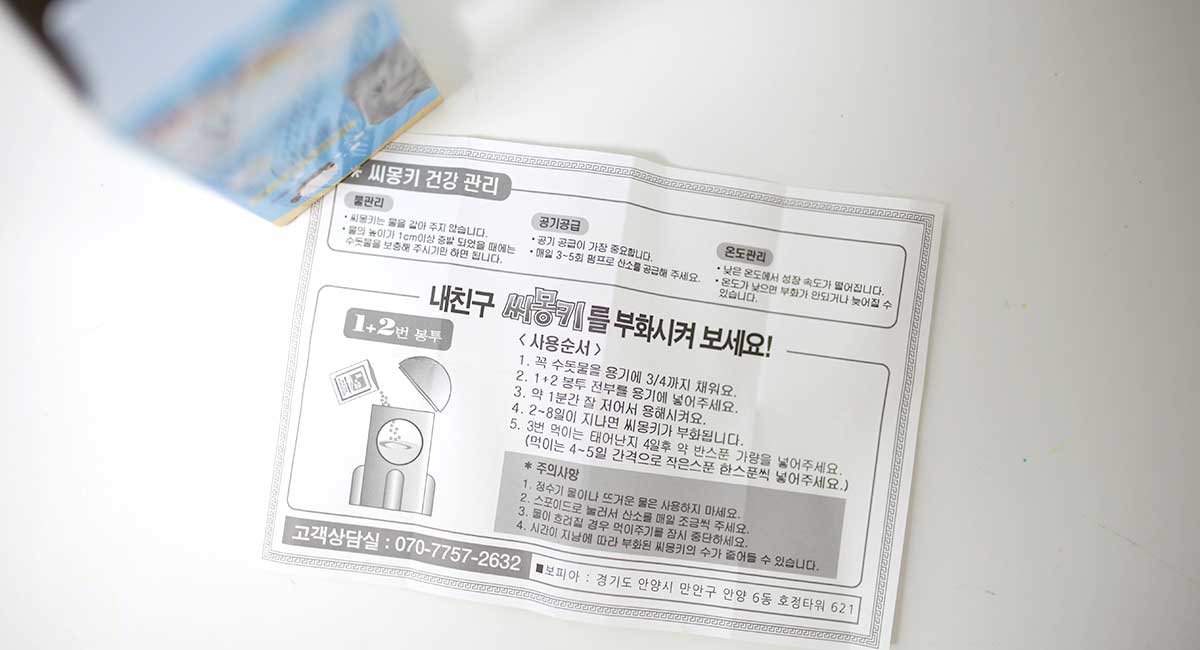 수돗물을 수조의 2/3 정도 담고 씨몽키가 들었다는 봉지를 털어 넣었다.