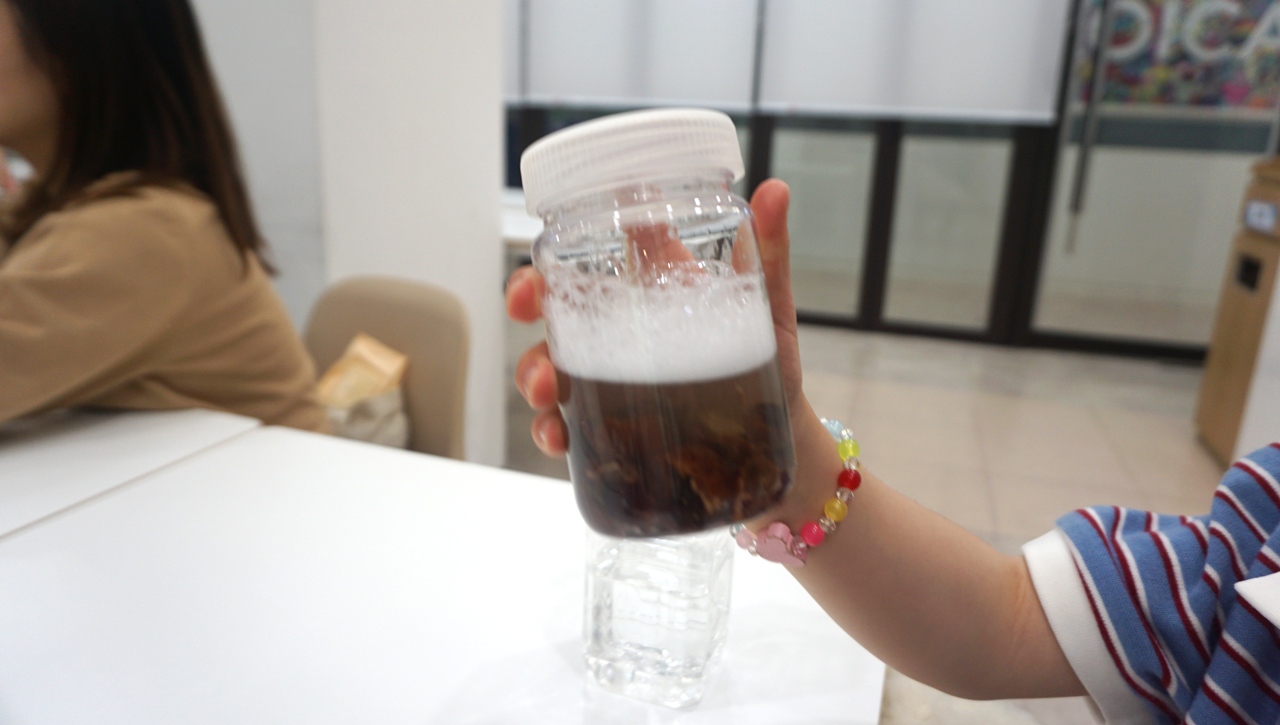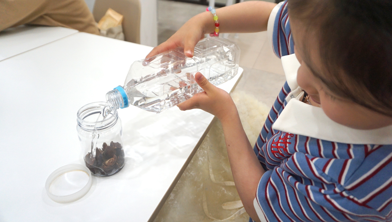 아이와 함께 준비된 병에 소프넛과 물을 넣고 흔들어 주면 세정제가 완성된다.