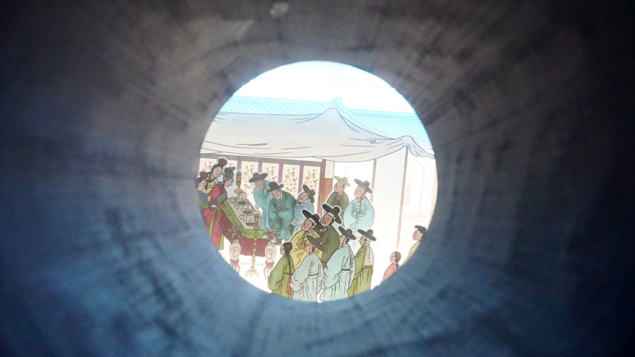 구멍 안으로 옛사람들의 평생도를 보고, 소리도 들을 수 있다.