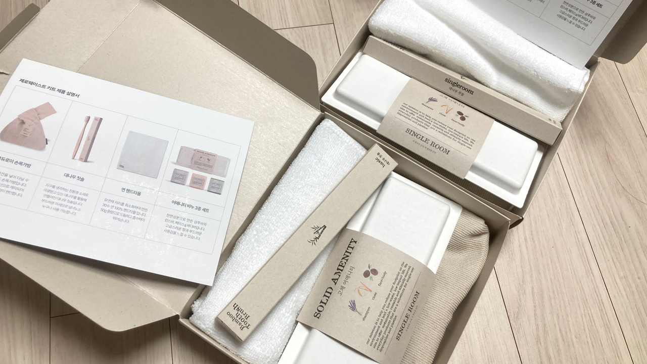 간단한 물건을 넣어 다닐 수 있는 코듀로이 손목가방, 대나무 칫솔, 면 핸드타월, 어메니티 비누 3종 세트 등이 있었다.