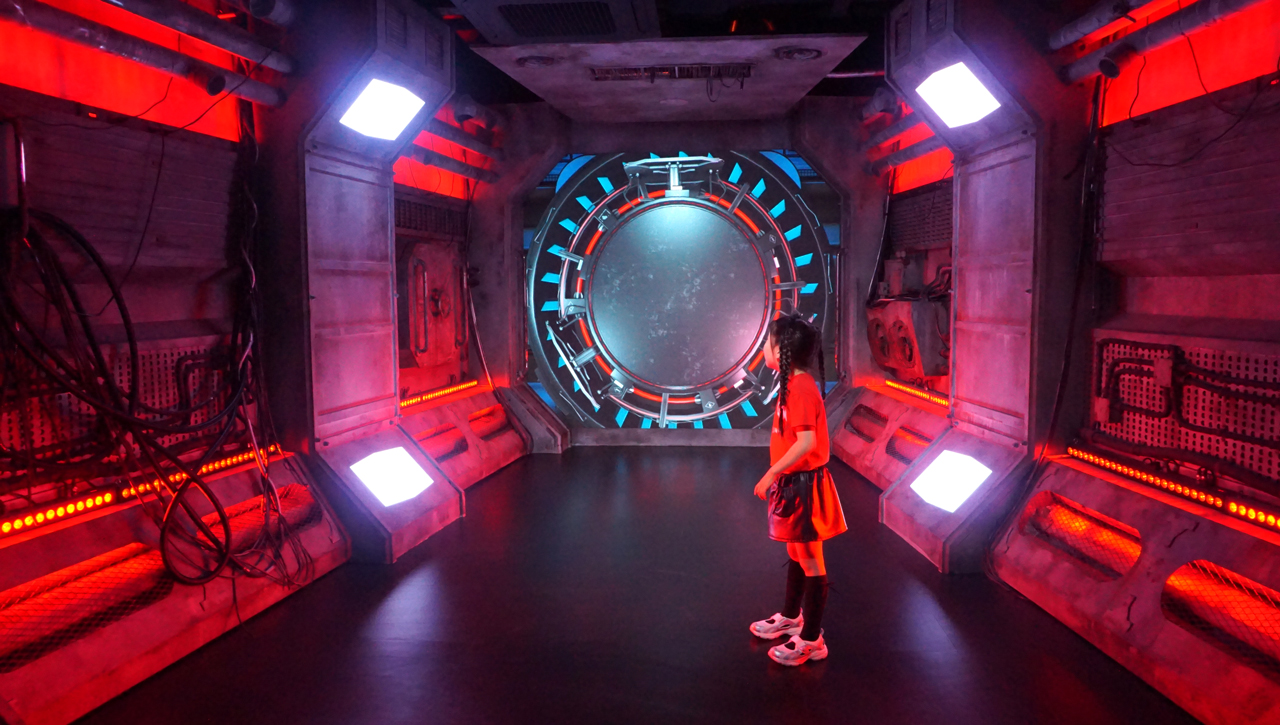 벽면과 천장 전체가 화려한 LED 조명과 미래적인 인테리어로 우주선으로 꾸며진 공간이다.