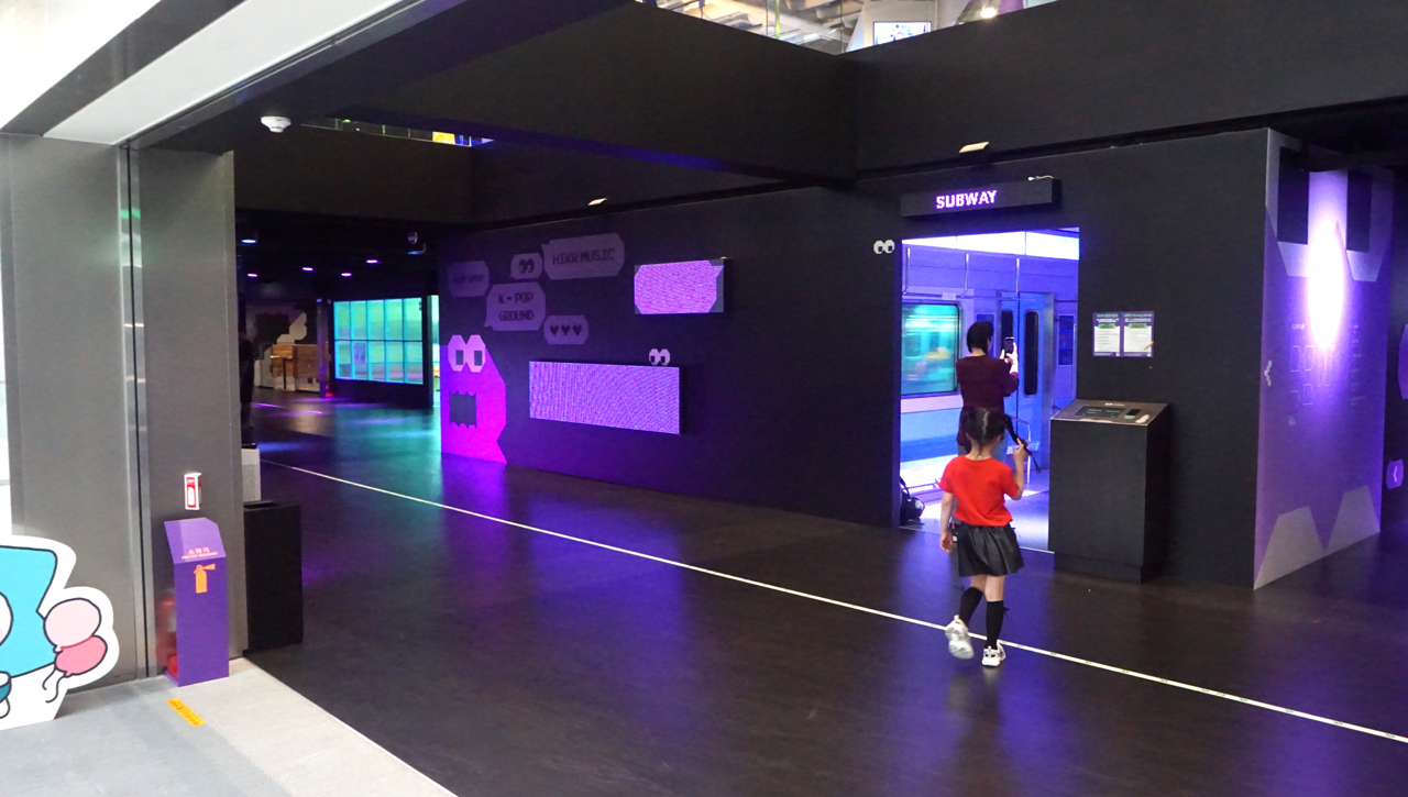실제 지하철 내부처럼 꾸며진 이 공간은 천장과 벽면을 따라 화려한 LED조명과 디지털 창문이 설치되어 있다.