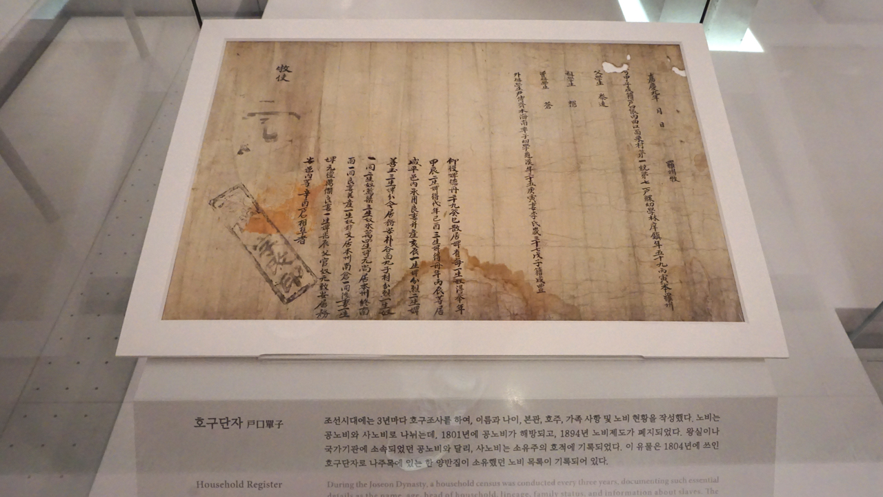 이 유물은 1804년에 쓰인 호구단자로 나주목에 있는 한 양반집이 소유했던 노비 목록이 기록되어 있다.