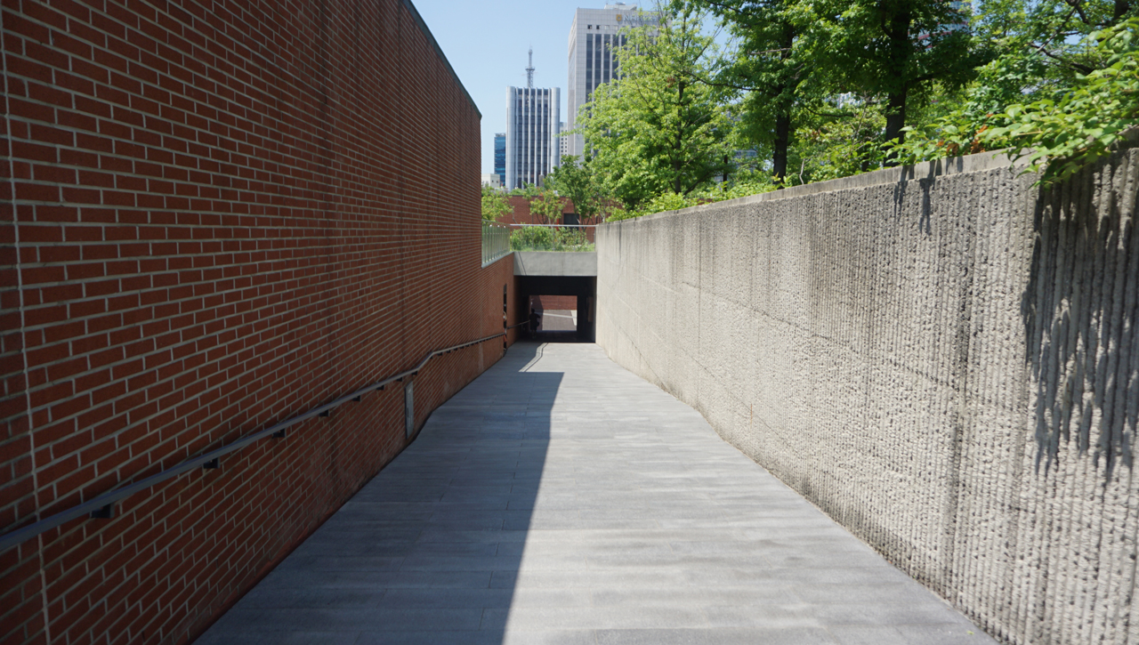 성 정하상 바오로 기념 경당에서 시작된 여정이 비스듬한 경사로를 따라 점점 아래로 향한다.
