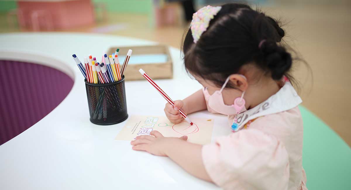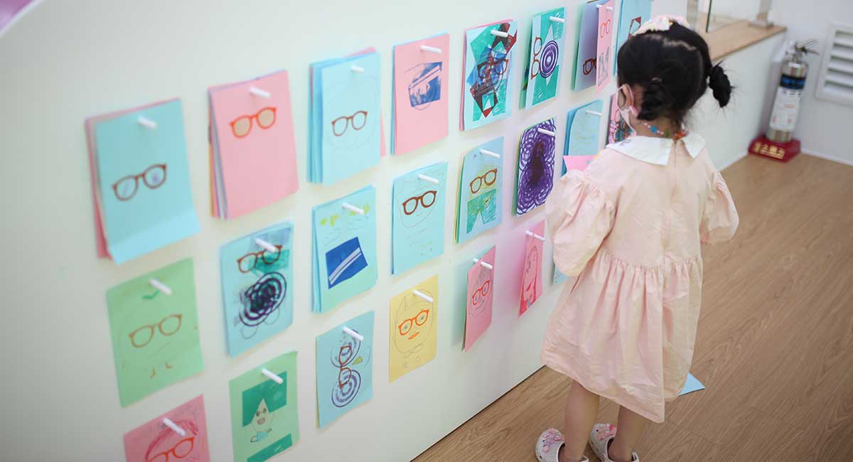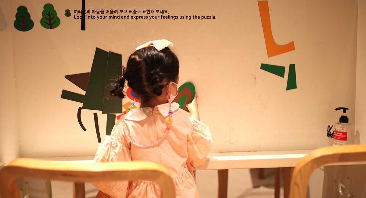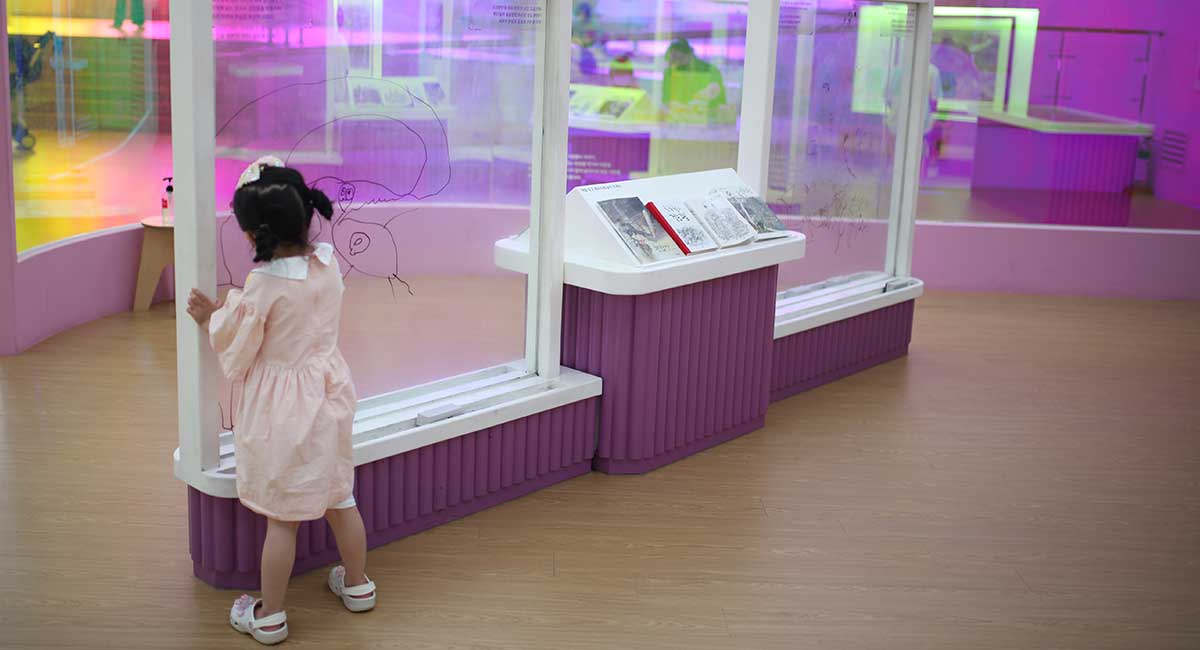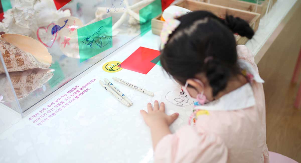아크릴 벽면 넘어 투과된 배경 위로 그리는 아이의 얼굴에는 묘한 미소가 피어올랐다.