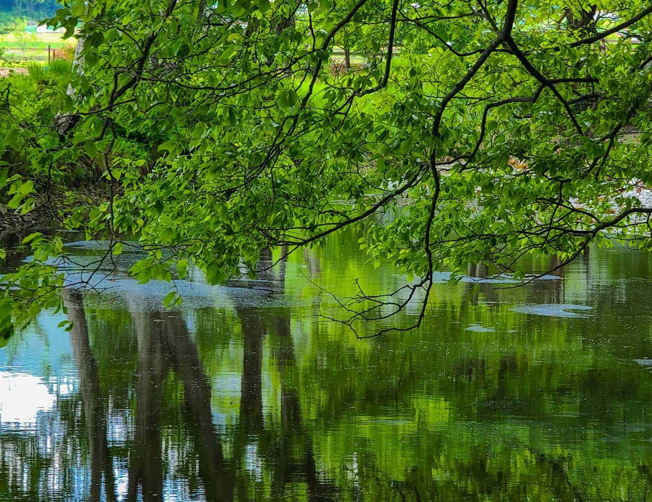 잔잔한 물결 위에 비치는 하늘과 나무들의 모습은