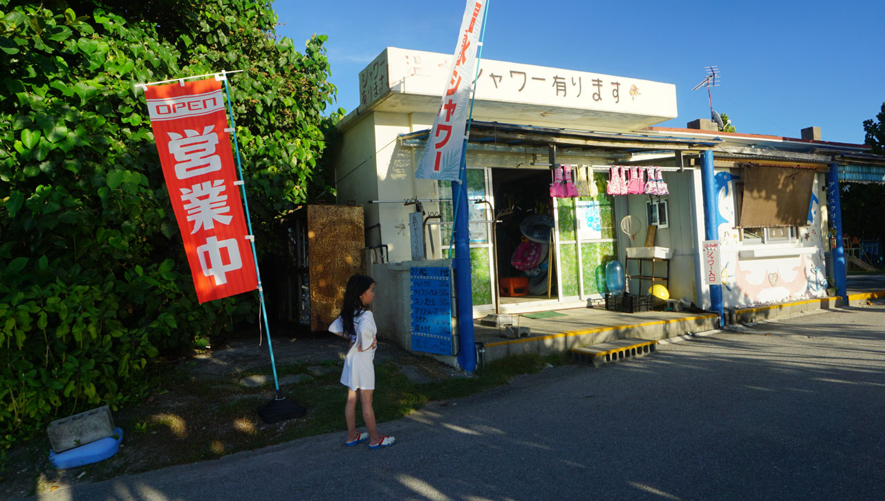 스노클링 장비대여와 샤워를 할 수 있는 가게와 슈퍼가 나란히 붙어있다.