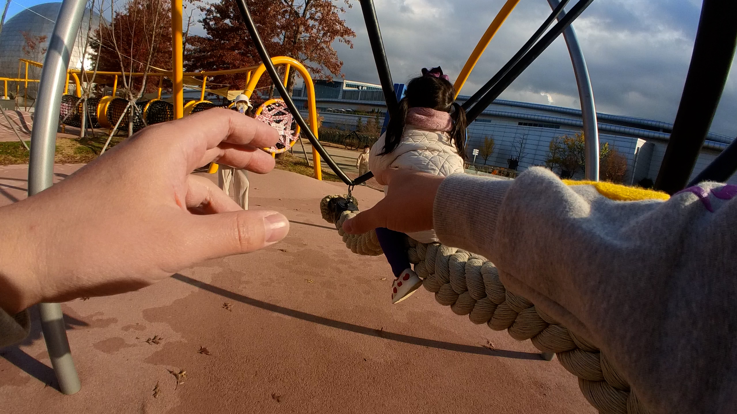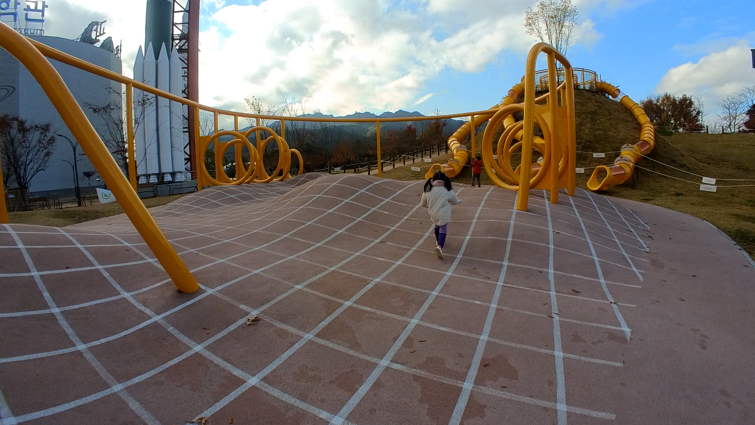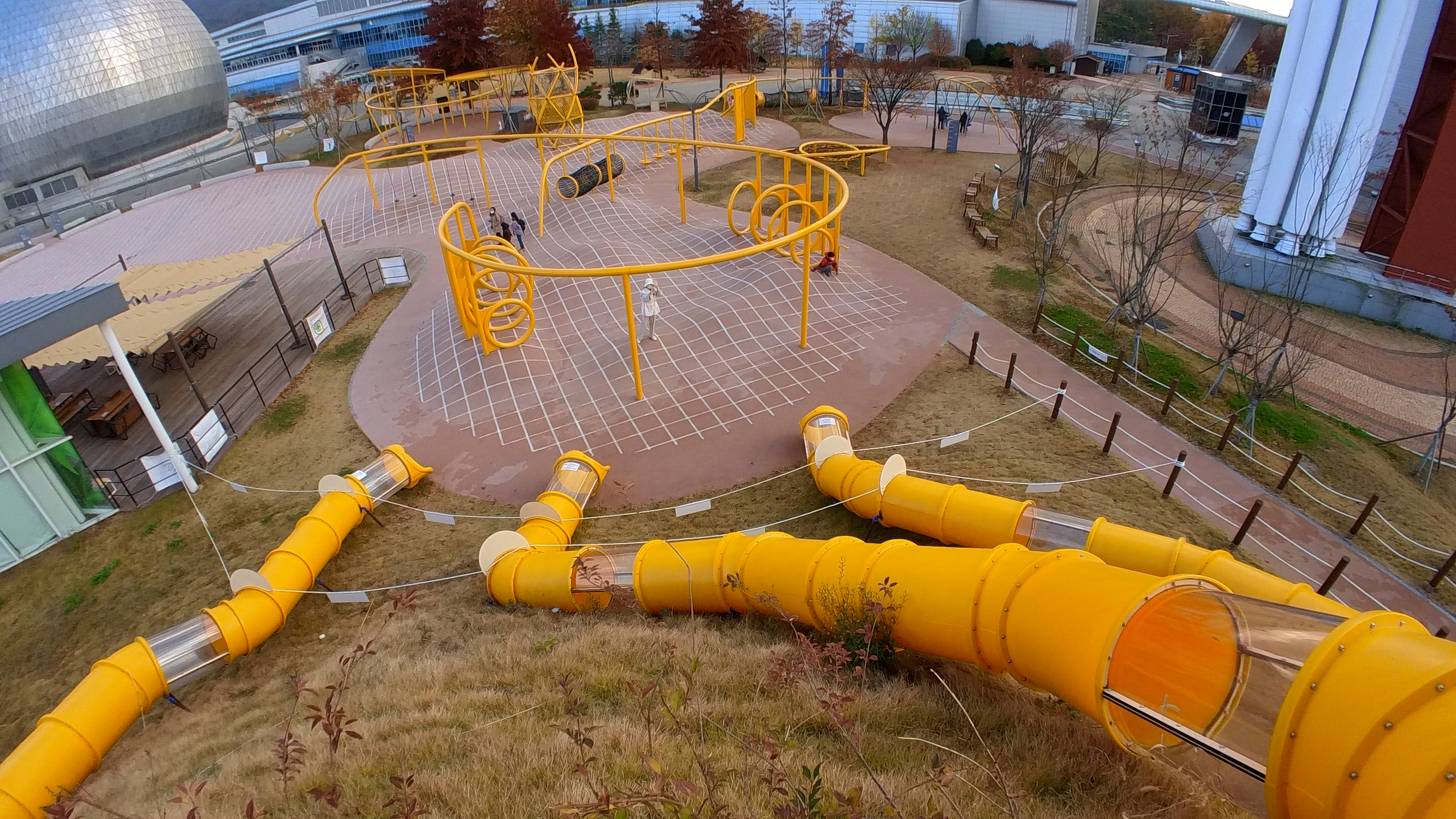 미끄럼틀 정상에서 봐라 본 놀이터의 전경은 재미난 미술작품 같기도 하다.