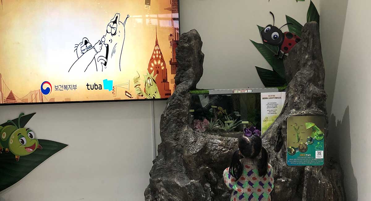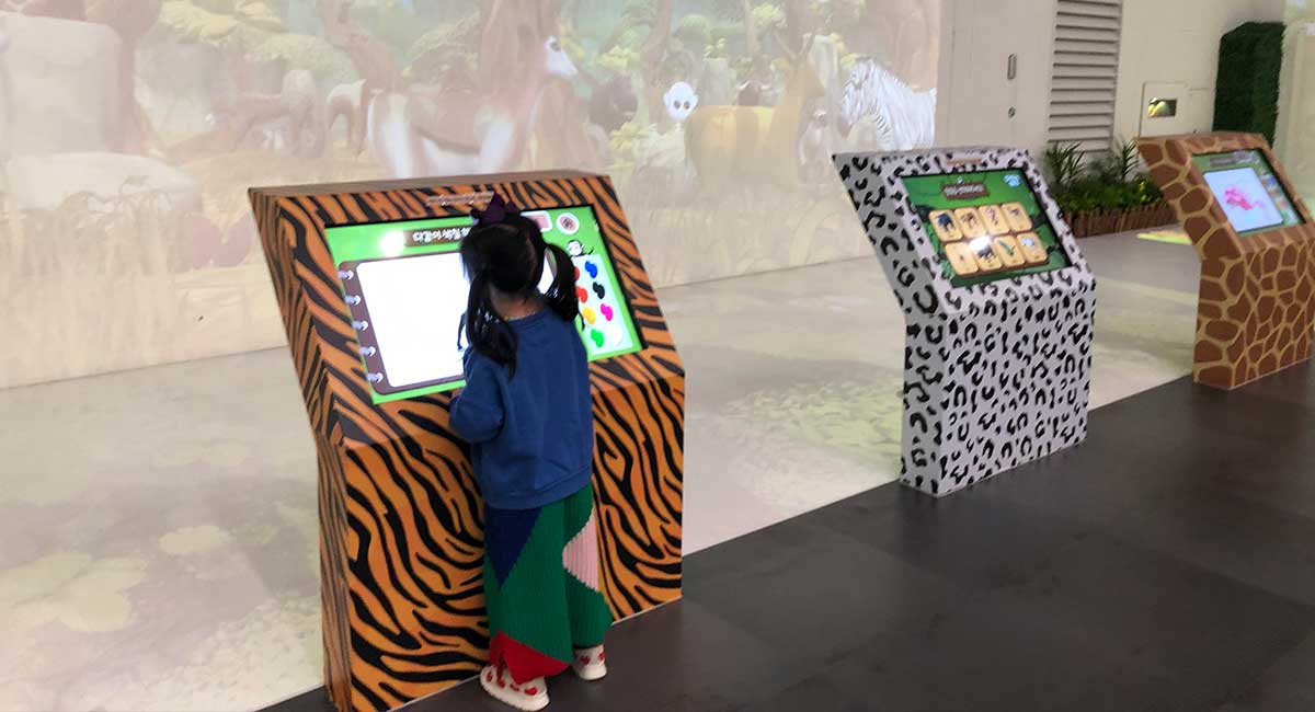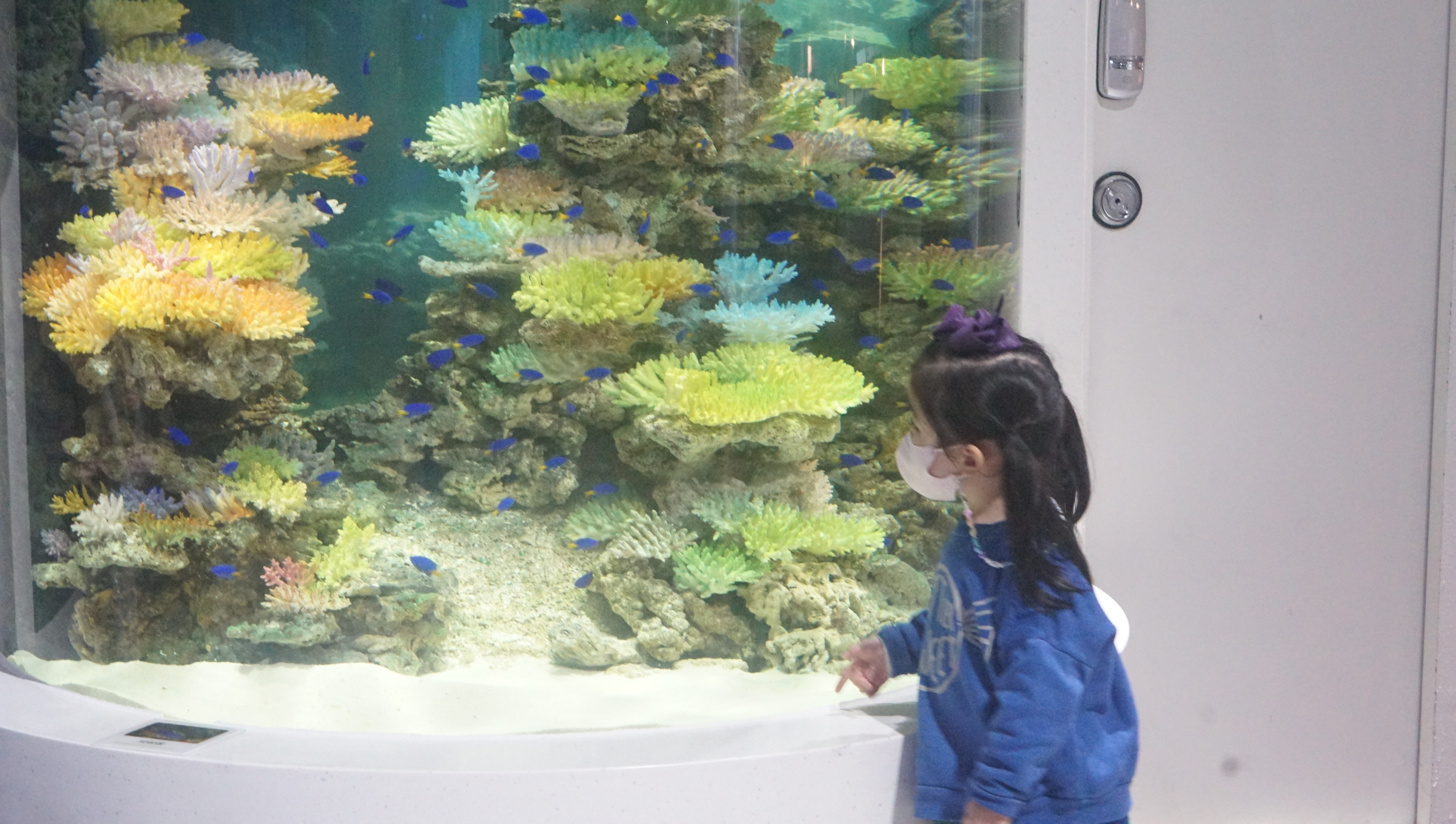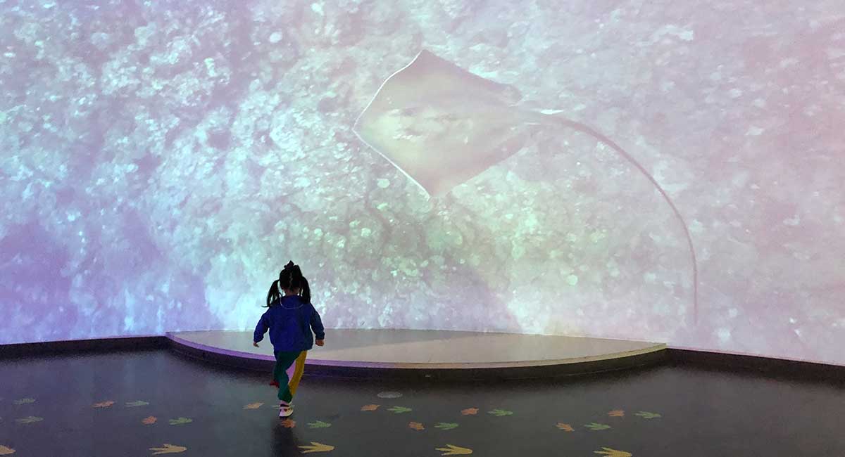 커다란 화면에서 유유히 수영하는 바다생물들을 만날 수 있는 디지털 수족관이다.