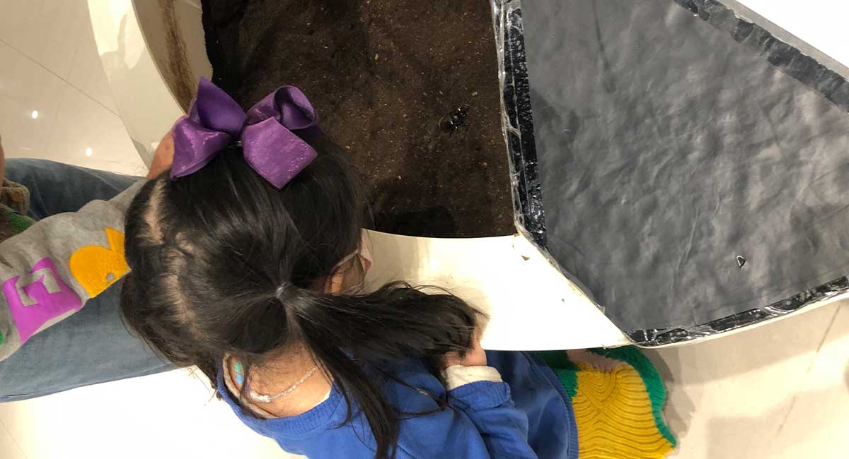 아이의 손에 닿는 질감이 재미있는지 애벌레를 손가락으로 쓰다듬었다.