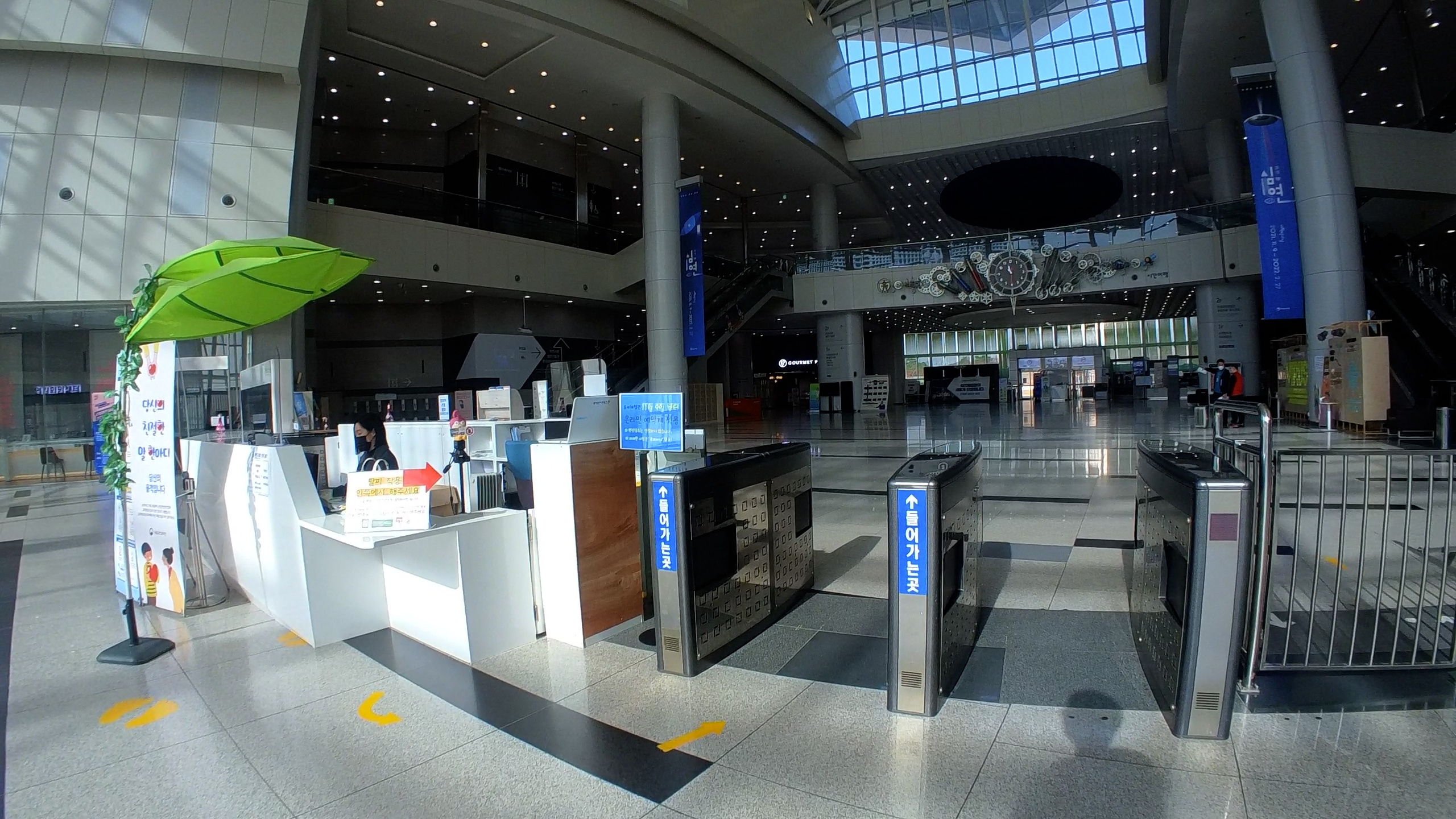출입 손목 띠를 매고 지하철 개찰구 같은 통로로 입장했다.