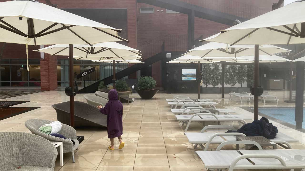 사우나 내 샤워실에서 샤워한 뒤 수영복으로 갈아입었다.