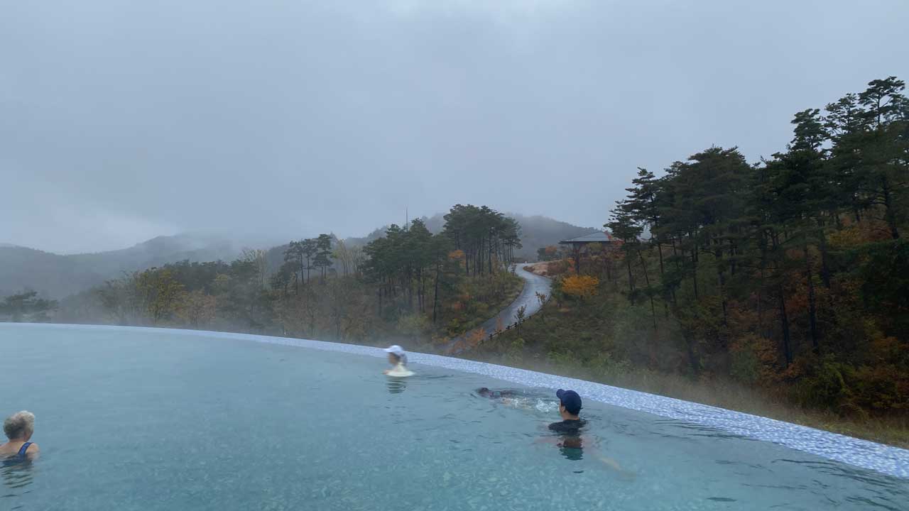 천천히 피어오르는 수증기 너머로 온천 수영장은