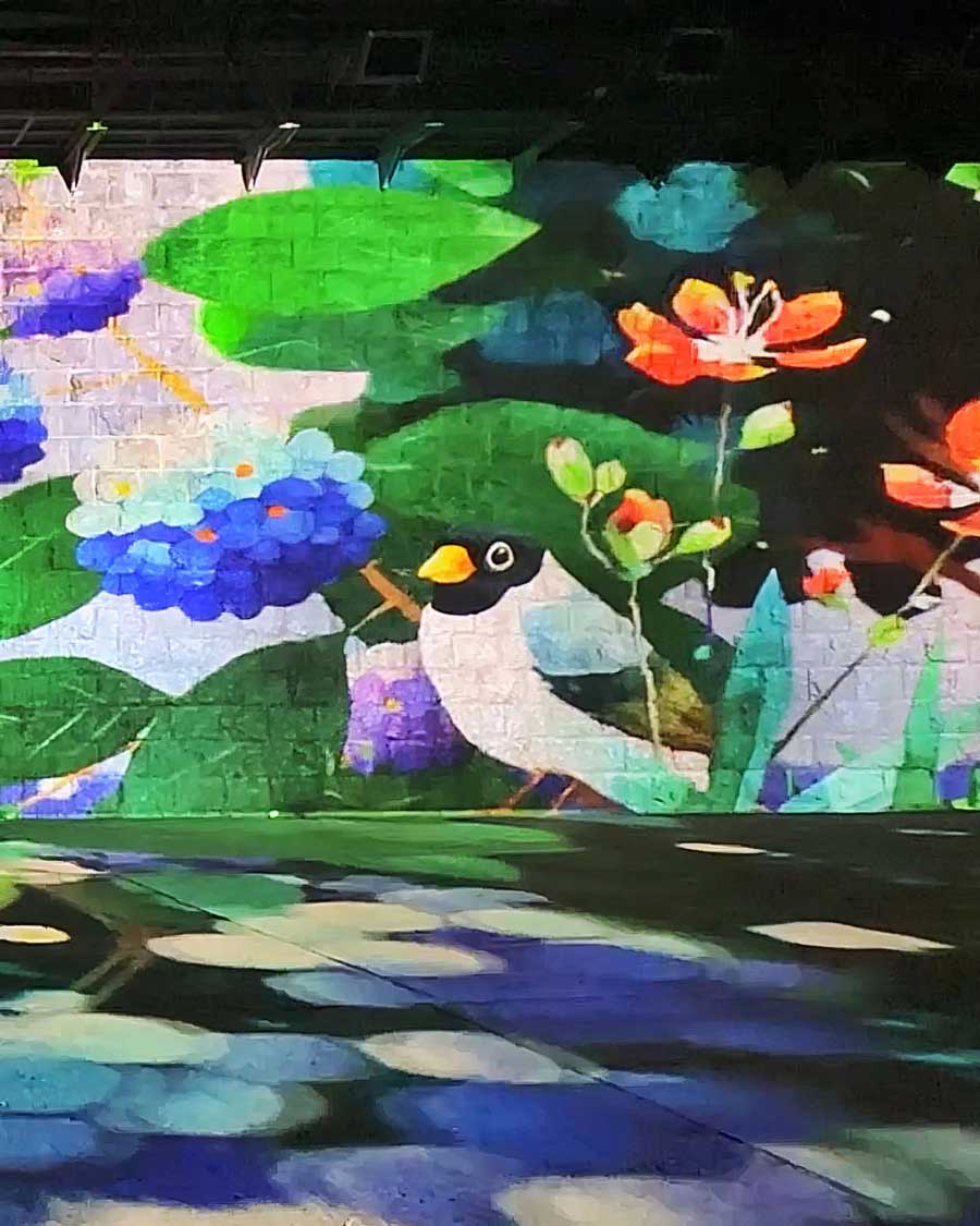 교량의 벽면 + 바닥 전체를 캔버스로 활용한 초대형 입체 미디어 파사드 전시이다.