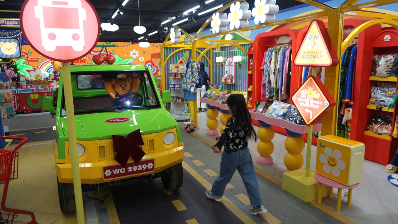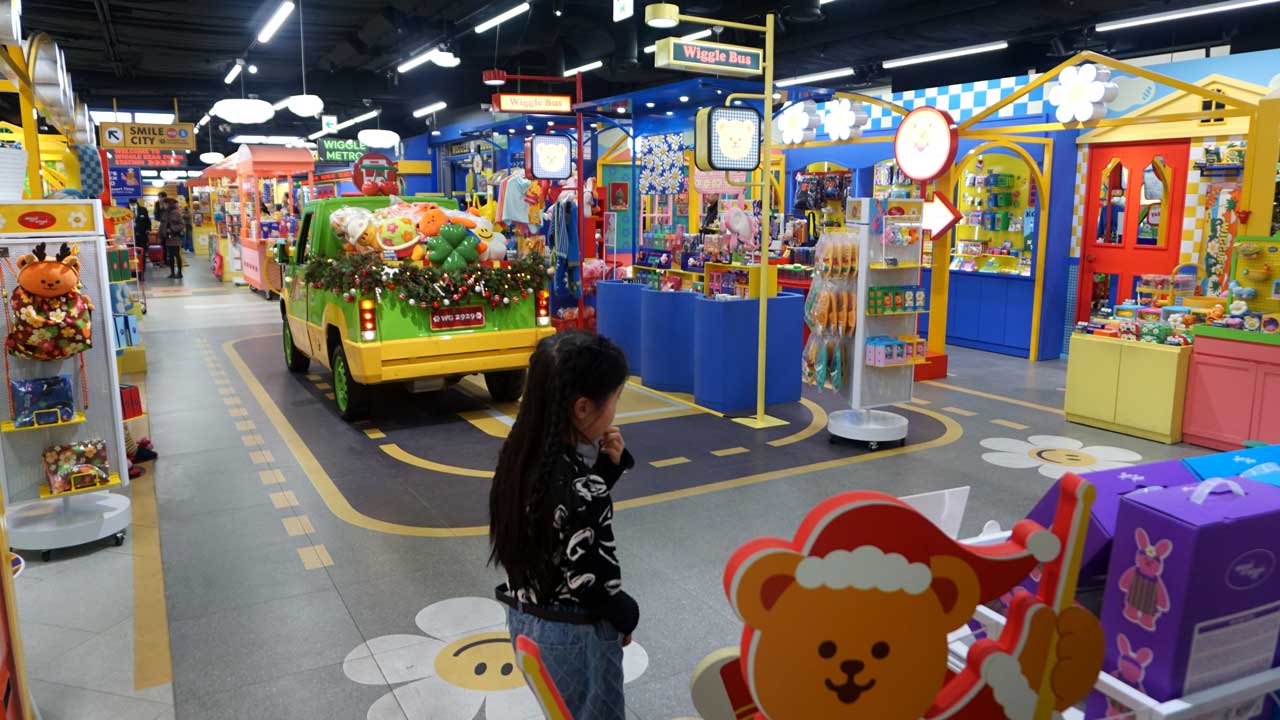 - Big character statues (Wiggle Bear, etc.) scattered throughout the store.