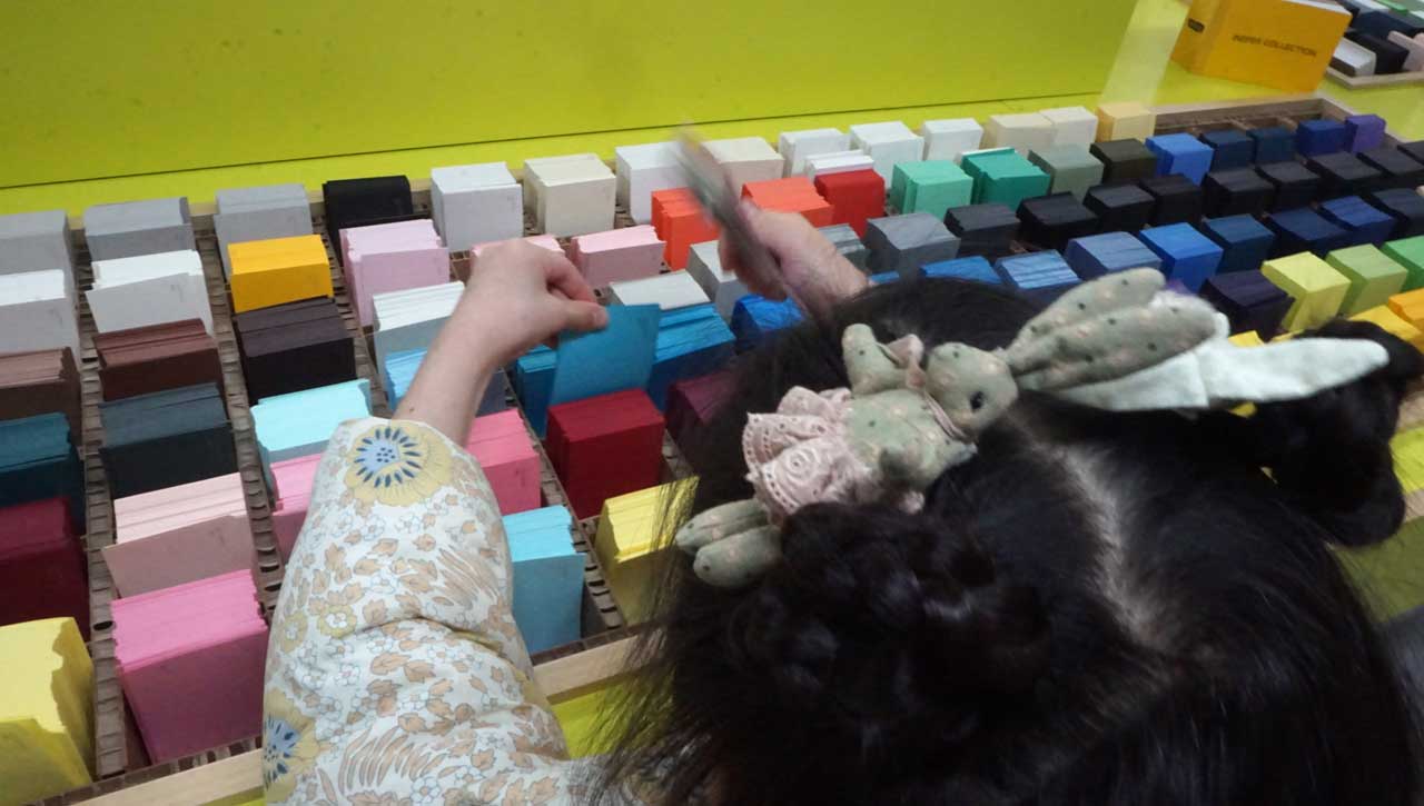 수십 가지의 컬러와 서로 다른 질감(러프한 느낌, 매끄러운 느낌, 반짝이는 펄감 등)의 종이 칩 중에서