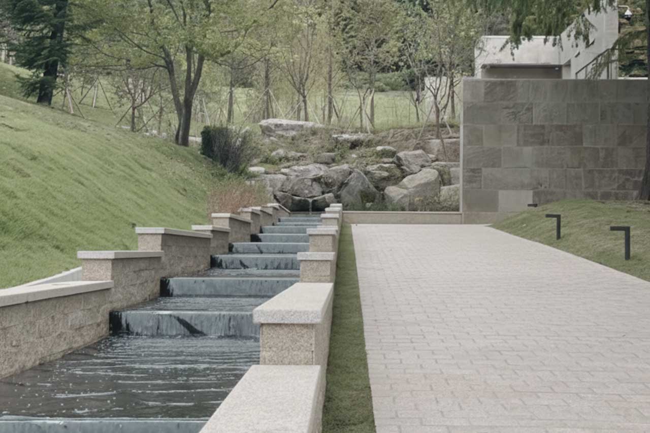 샌드스톤 옹벽과 초록 풍경이 어우러진 인테리어가 인상적이에요.