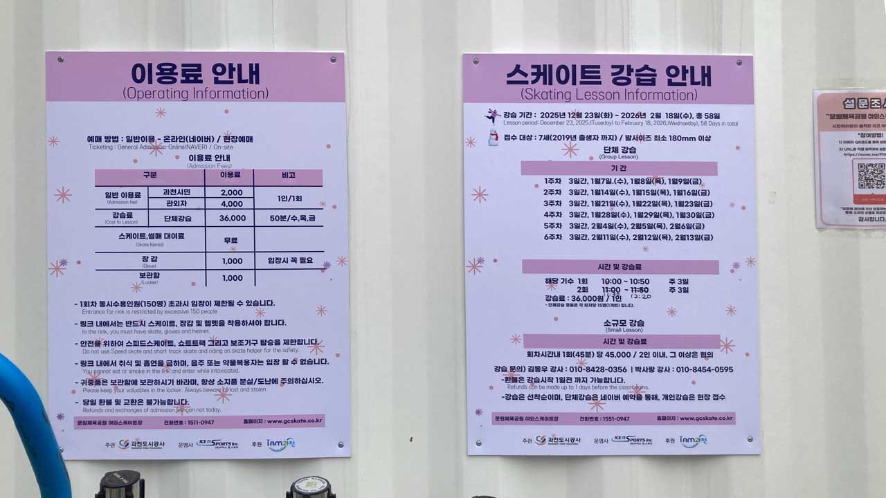 - 이용료(장비 포함): 과천시민 2,000원 (신분증 필수) / 관외시민 4,000원