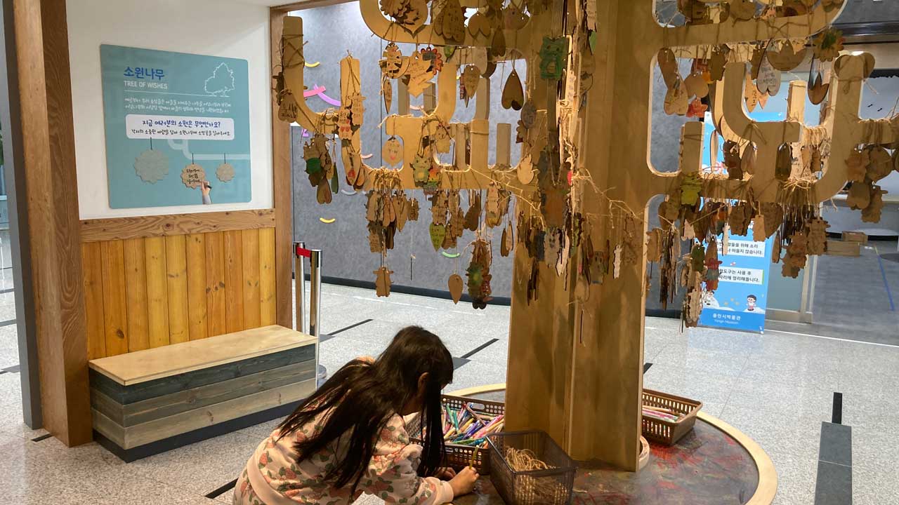 안내데스크에서 캐릭터로 조각된 나무판을 받아 소원을 적은 뒤 나무에 걸어둔다.