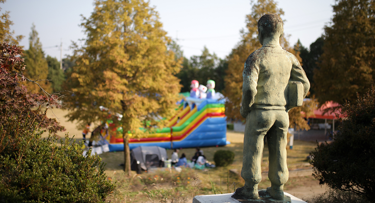 이제는 잔디로 뒤덮인 너른 운동장을 바라보는 낡은 동상은 옛 모습 그대로 우두커니 서 있었다.