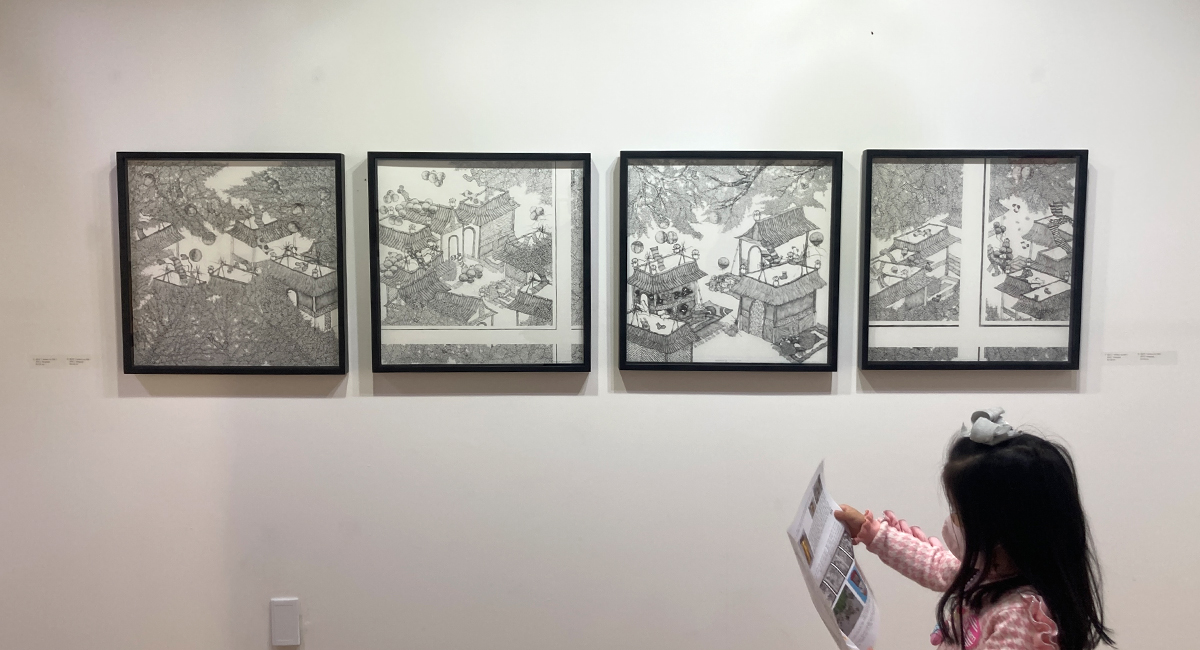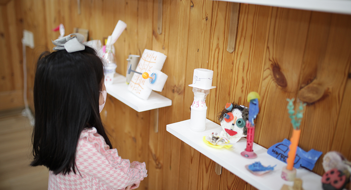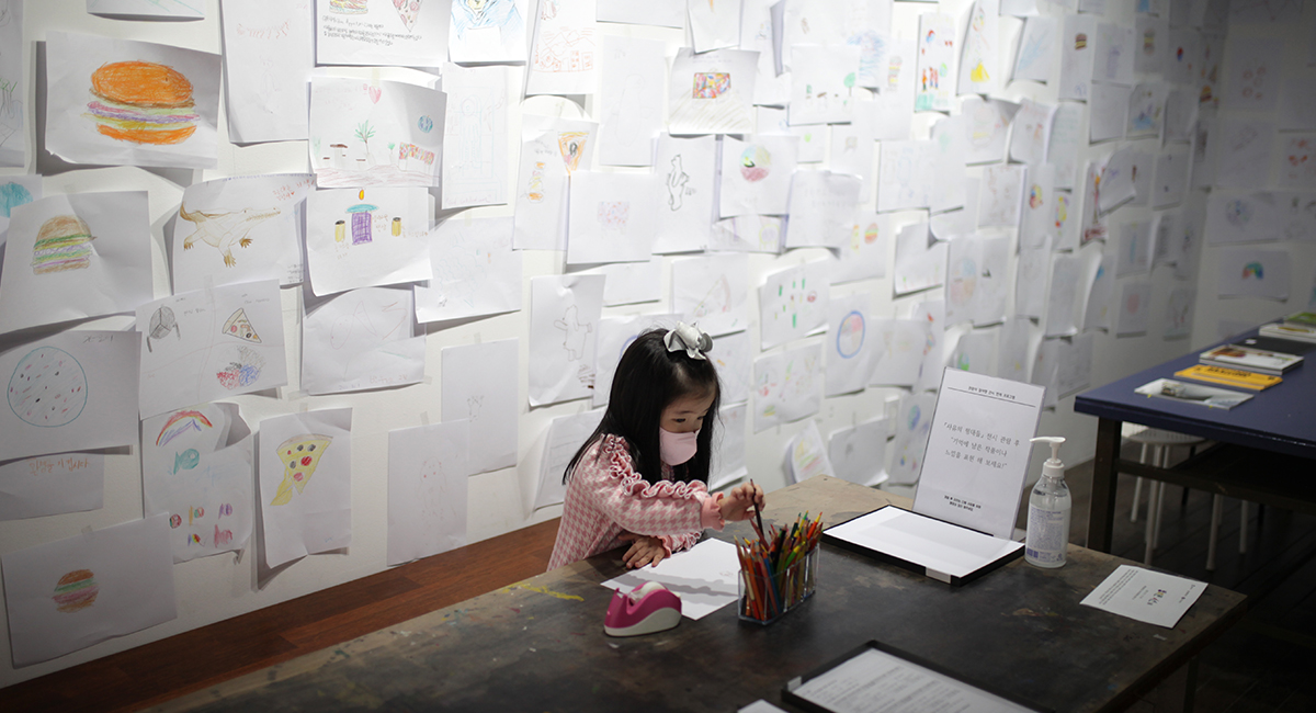 벽면에는 이미 관람한 어린이들의 다양한 시각으로 그린 그림이 붙여져 있었다.
