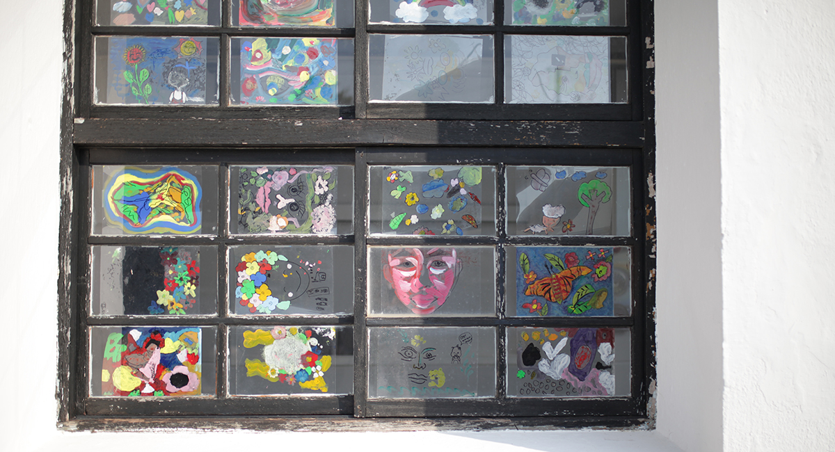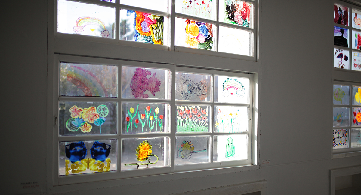 옛 학교의 창에 투박하게 그려진 그림들이 정감스러운 분위기를 풍겼다.