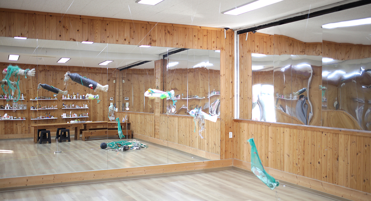 3면이 유리로 된 공간 안에서 쓰레기로 재활용된 물고기들이 유유히 유영하고 있었다.