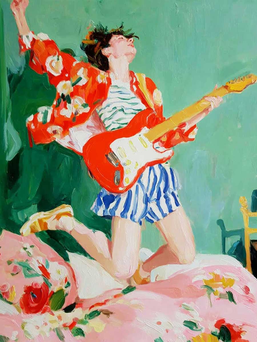 By blending vibrant, high-saturation colors with soft pastels, he captures the emotional intimacy of youth and romance.