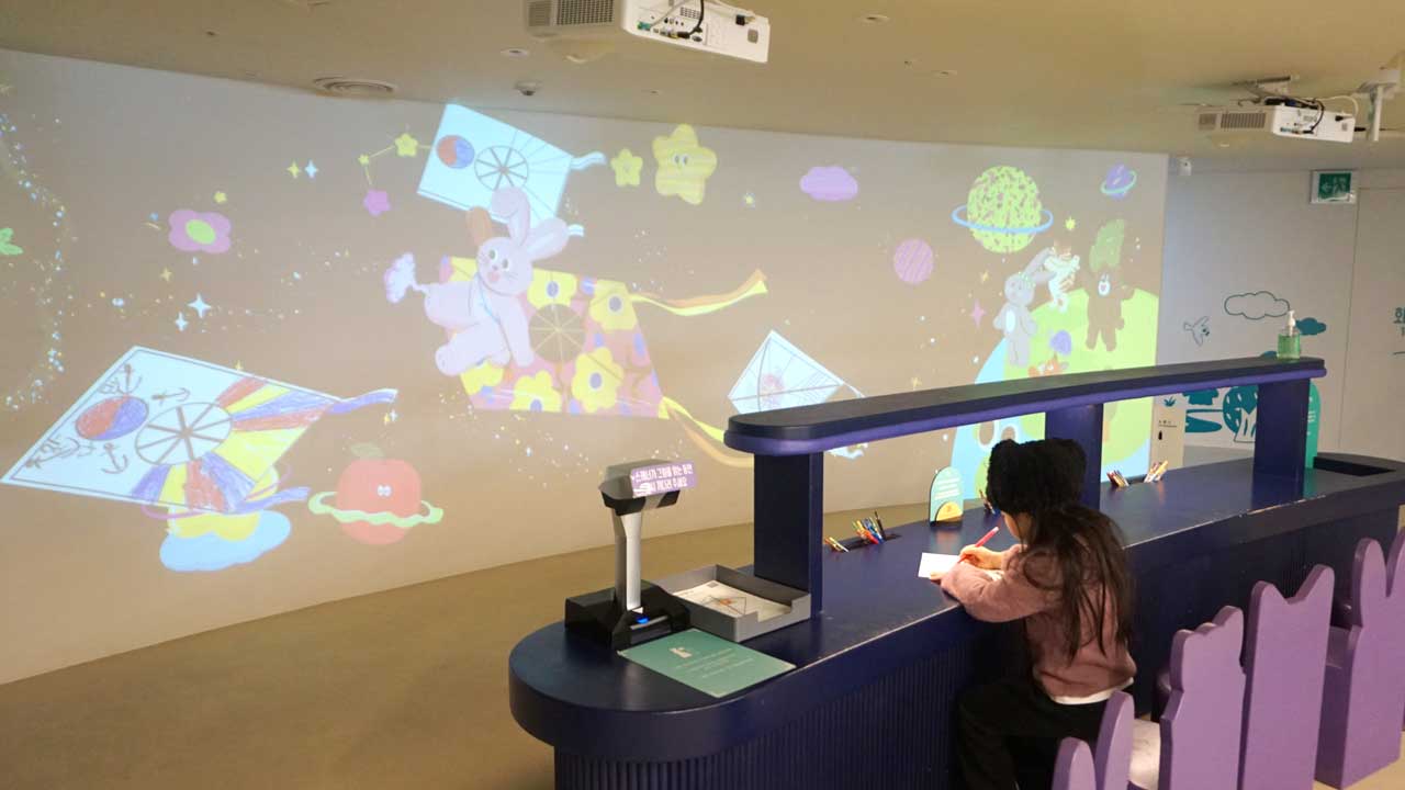 이 전시에서 아이들에게 가장 인기 있는 코너는 단연 '디지털 연 날리기' 체험이다.