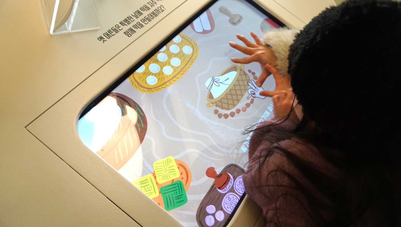 화면 속에서 재료를 고르고 떡을 빚어보는 인터랙티브 게임을 체험이다.