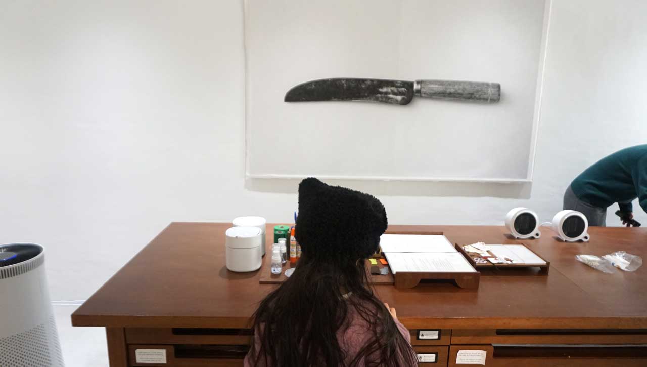 유리벽 너머 가득 쌓인 한지 서랍을 하나씩 열어보며,