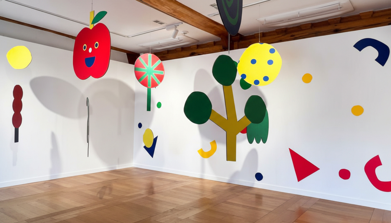 익숙한 풍경이 낯설고 즐겁게 다가옵니다. - 설치 & 모빌: 정적인 미술관을 입체적으로 만드는 대형 설치물과 흔들리는 모빌들이 공간에 생동감을 불어넣습니다.