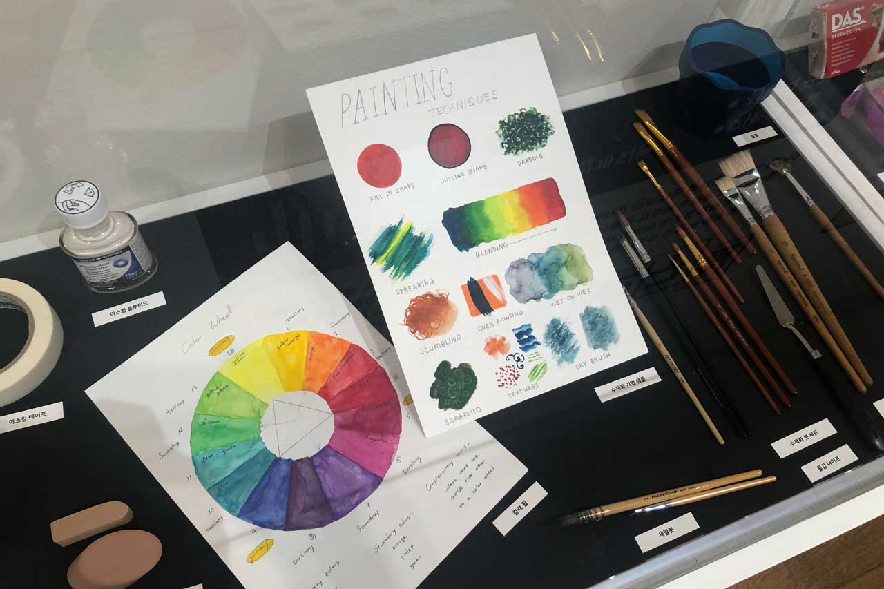 파스텔, 수채화, 드로잉 도구 등 다양한 재료가 구비되어 있었다.