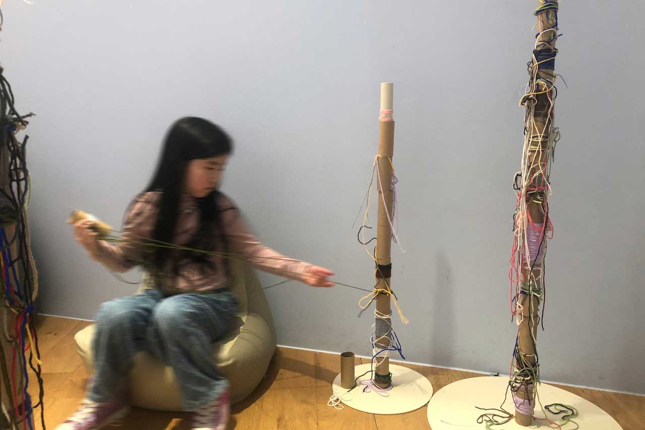 완성한 실타래를 기둥에 꽂아 실타래를 연결한다.