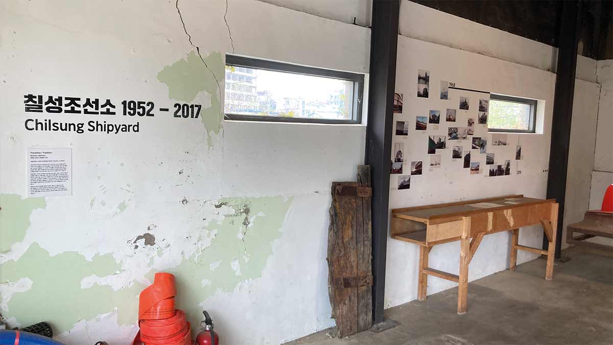 칠성조선소의 역사가 벽면을 타고 전시되어 있다.